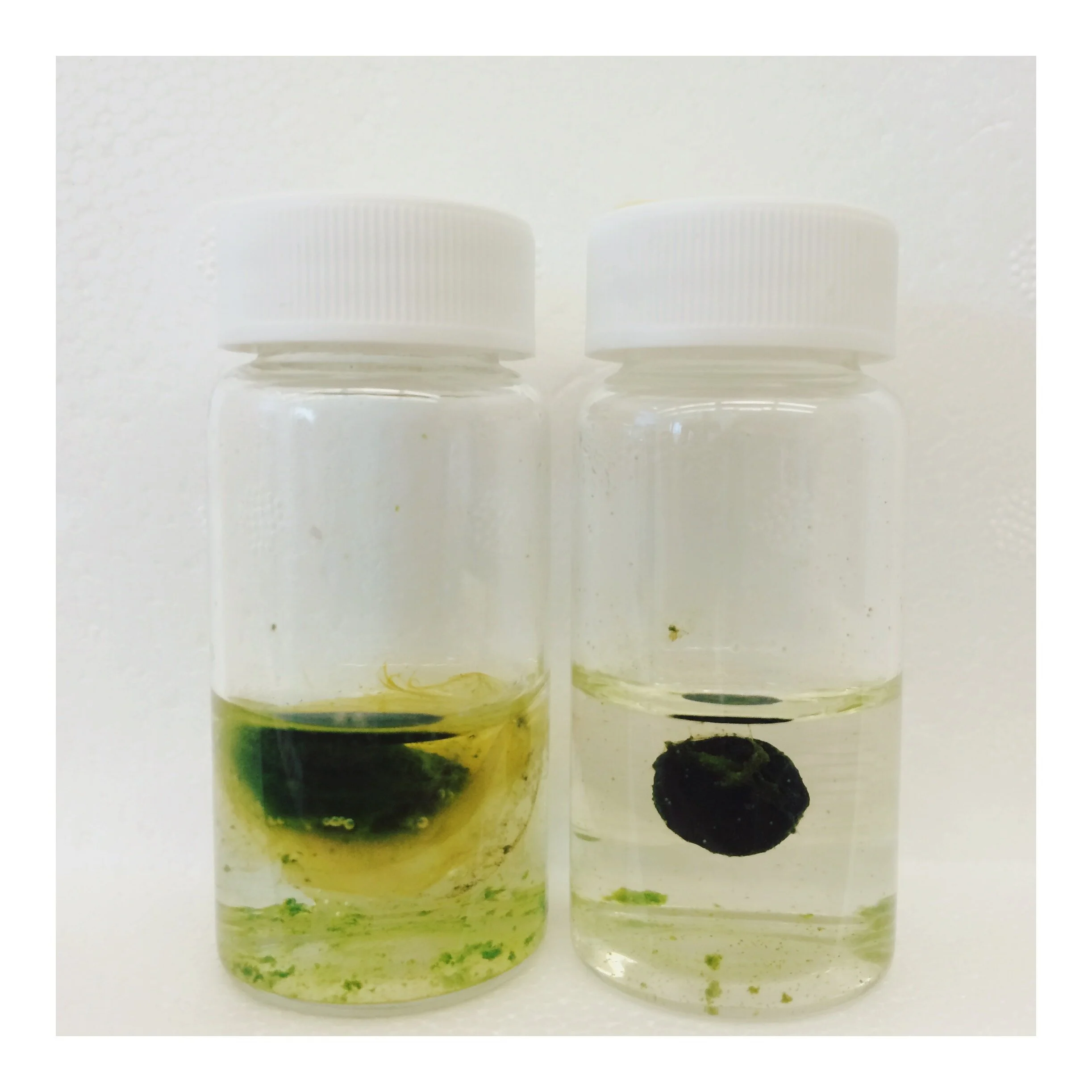 Photogranules are generated in incubations of activated sludge batches under static conditions. They are also formed in turbulently mixed sequencing batch reactors (SBRs) performing carbon and nitrogen removal consistent with conventional wastewater treatment. Both types of photogranules are dense, spherical or sphere-like aggregates of the typical blue-green color of filamentous cyanobacteria. The highest densities of filamentous cyanobacteria were visible in the outer layer of photogranules. In this layer, the cyanobacteria and copious amounts of extracellular polymeric substances (EPS) form an interwoven mat-like structure.
